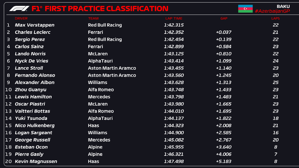 O líder do campeonato, Max Verstappen, liderou o primeiro e único Treino Livre para o Grande Prêmio do Azerbaijão em Baku, o piloto da Red Bull marcou um tempo de 1 minuto 42 segundos e 315 milésimos, Charles Leclerc da Ferrari ficou apenas à 37 milésimos do tempo do holandês, Sérgio Pérez completou o pódio 139 décimos atrás.