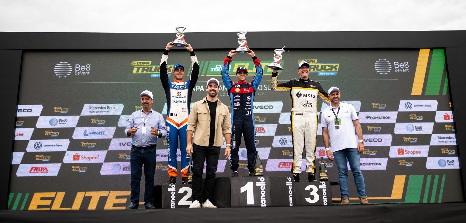 A Volkswagen dominou o domingo (12) da Copa Truck Be8 BeVant na classe Elite em Santa Cruz do Sul. No retorno à pista de 3.531 metros, a marca alemã, junto à R9 Competições, foi o grande destaque da etapa. Dono do Troféu Shopee Pole Position, Nicolas Giaffone venceu com autoridade a Corrida 1 e terminou a segunda prova atrás apenas do companheiro de equipe, Ricardo Alvarez, que conquistou sua primeira vitória na temporada 2026 após dois segundos lugares em Campo Grande (MS).